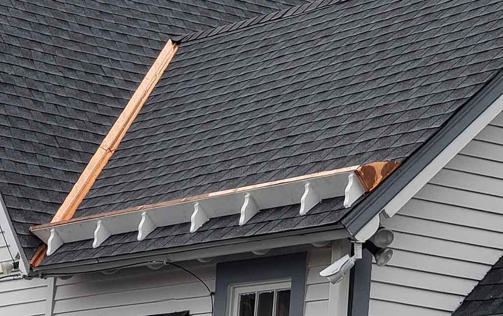 A metal Yankee gutter that would frequently be painted red or with a rust inhibitor on a slate roof allows the rafter tails to be seen on this circa 1915 home. Rafter tails are a character defining feature. People who saw them off should be cursed with runners in their stockings!