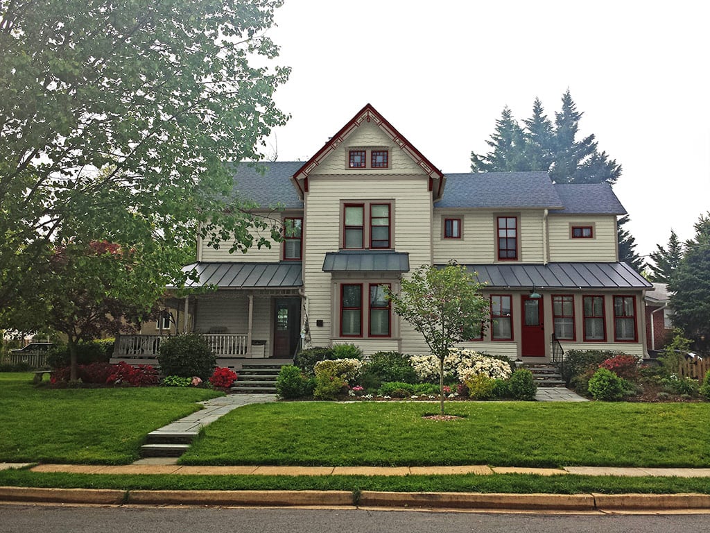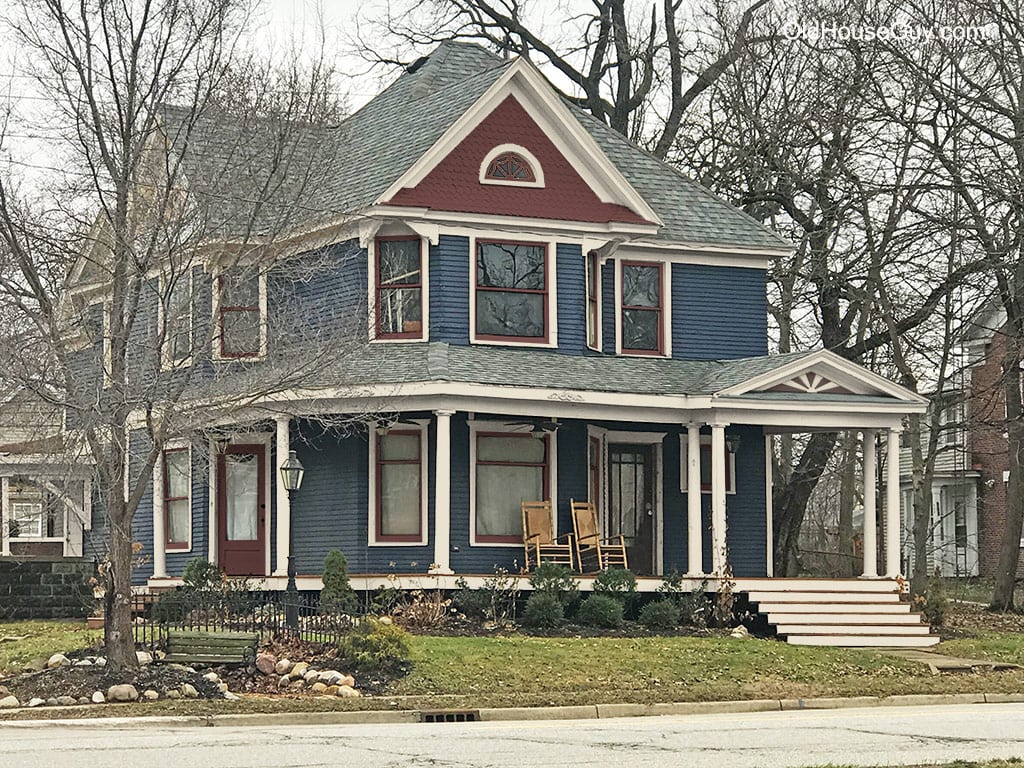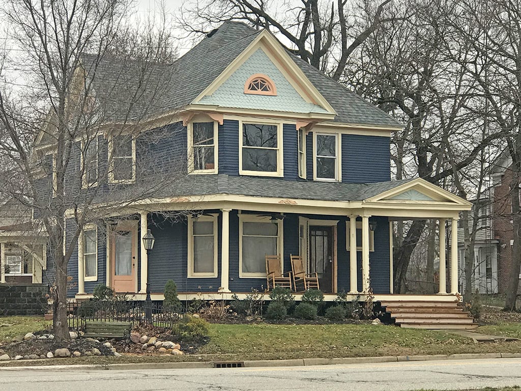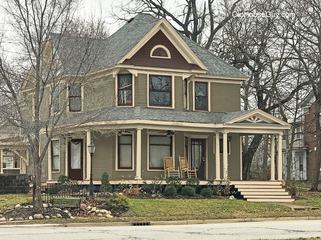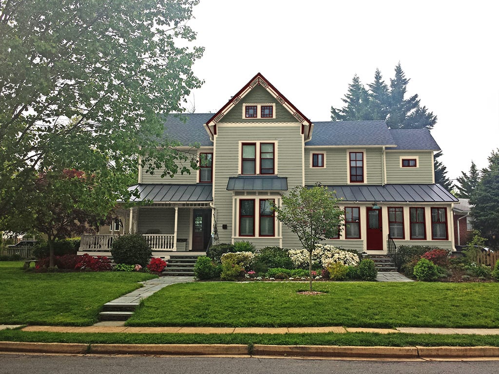 The homeowner prefered to keep the current blue body color but wanted a new trim and gable color. The light blue gable is way too light. The gable color should be darker than the body however since the body is so dark an equal shade should be used. The light blue is also a very cool color that does not work with the warm cream trim color. It still amazes me how people try to “Victorianize” their houses by adding a random peach window in the gable (which has no relation to the other window color), peach brackets under the gable and a peach side door. This can really ruin a house.
