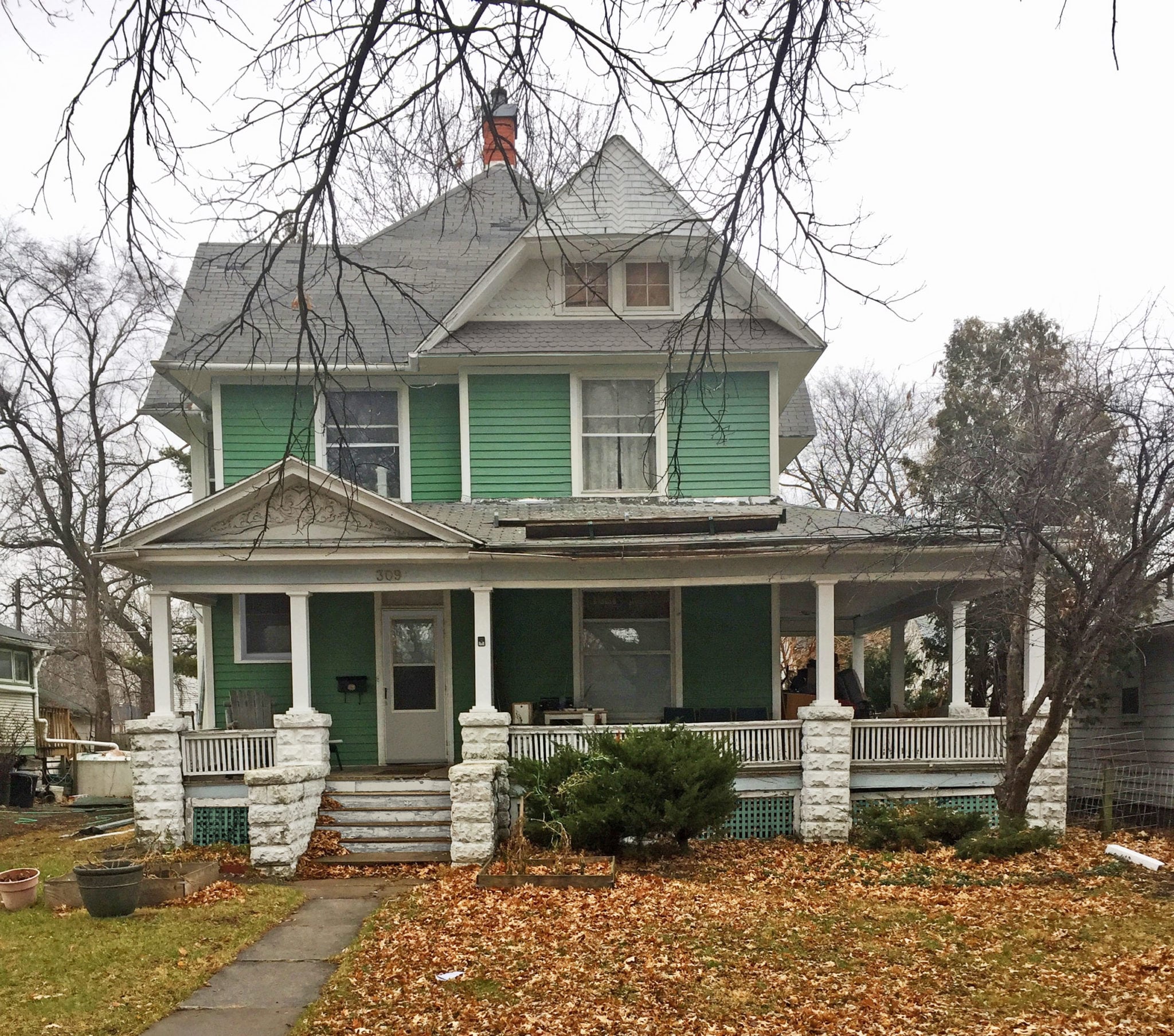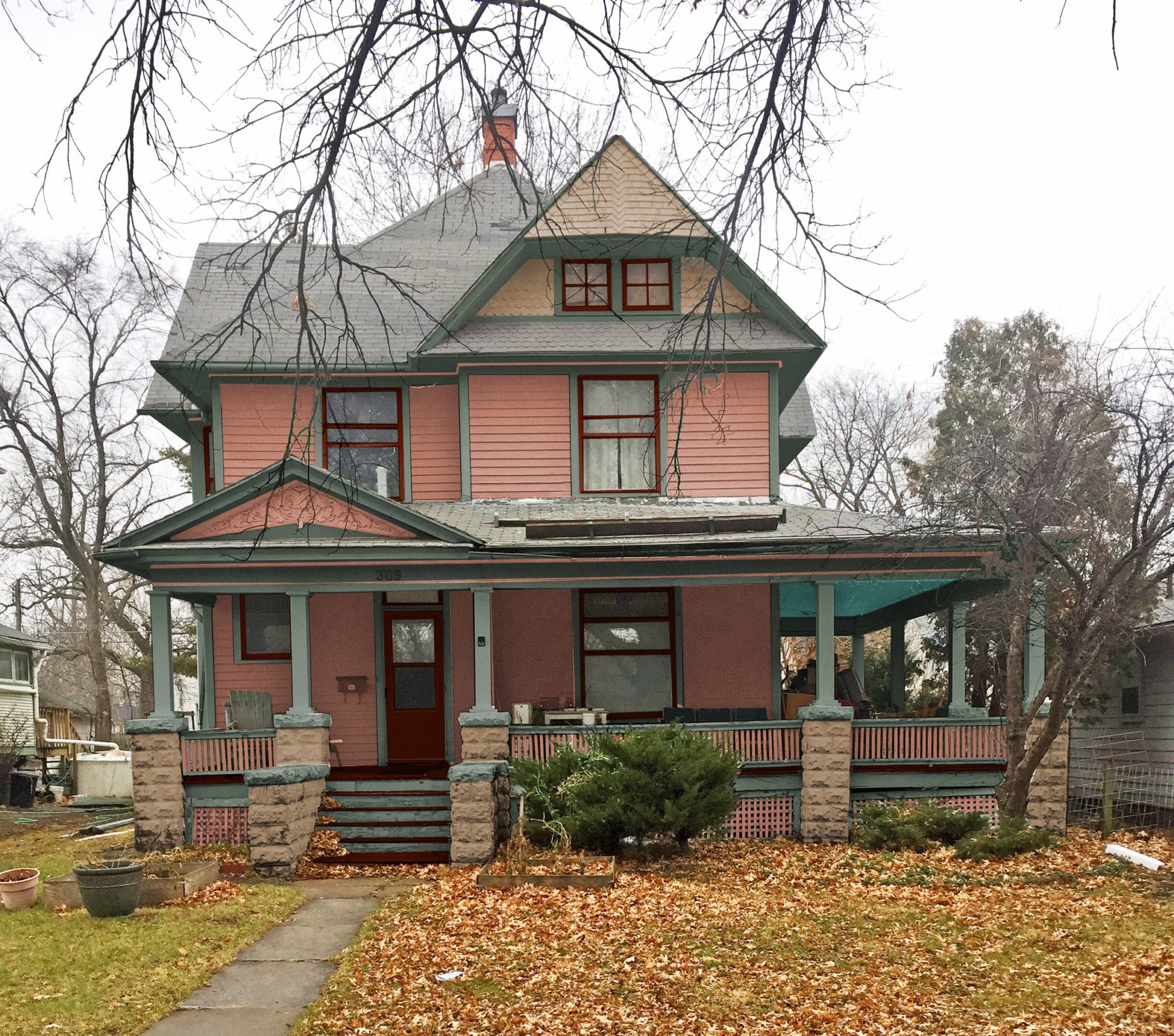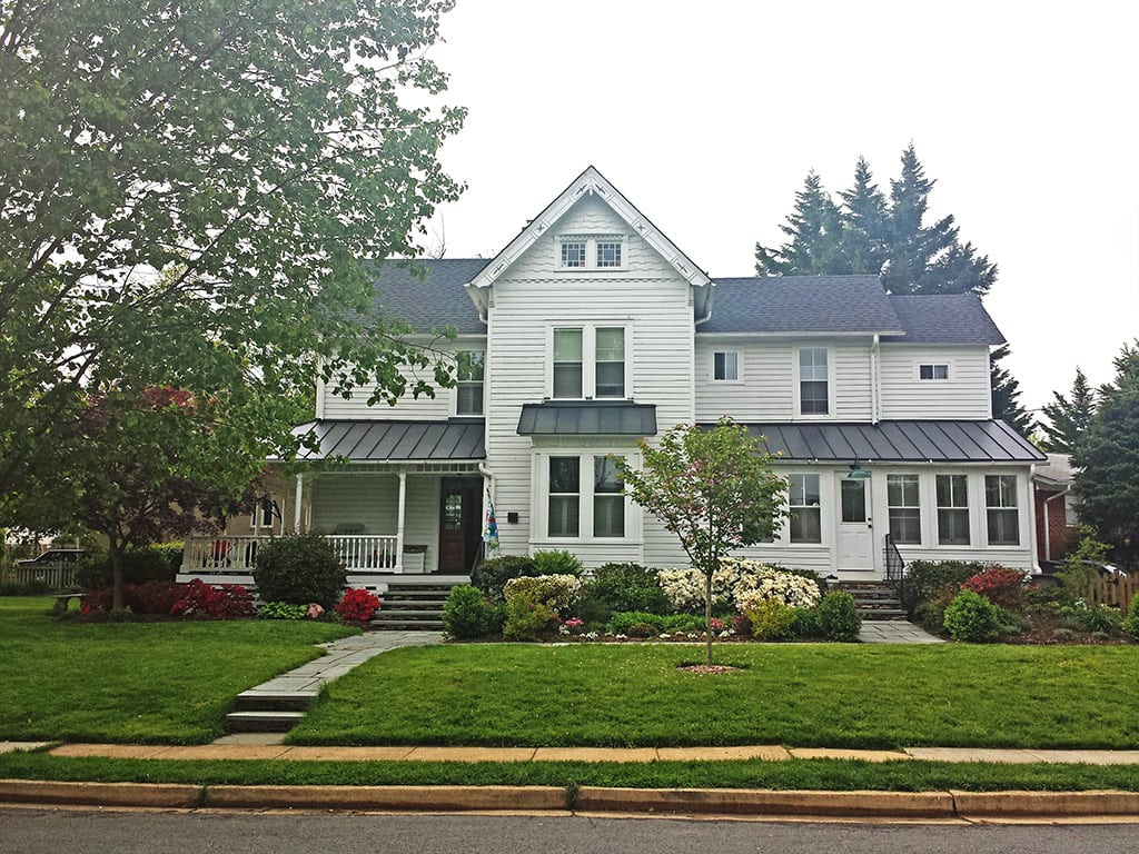 The homeowner prefered to keep the current blue body color but wanted a new trim and gable color. The light blue gable is way too light. The gable color should be darker than the body however since the body is so dark an equal shade should be used. The light blue is also a very cool color that does not work with the warm cream trim color. It still amazes me how people try to “Victorianize” their houses by adding a random peach window in the gable (which has no relation to the other window color), peach brackets under the gable and a peach side door. This can really ruin a house.