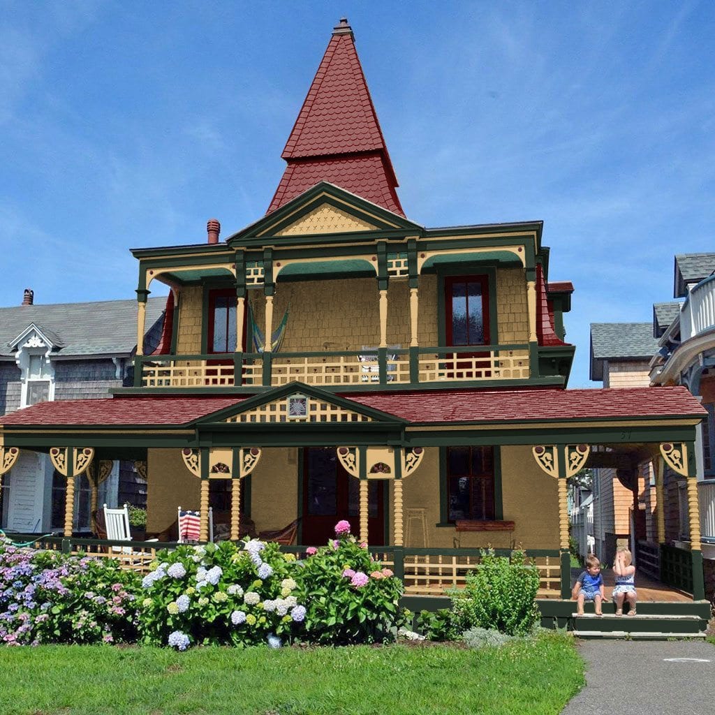 Blue is not a historic paint color and it looks awful on this house partially because of the bad color placement. The color placement on this house really throws the house off.
