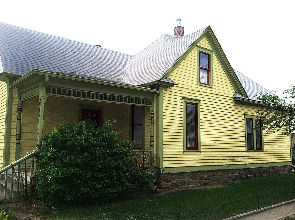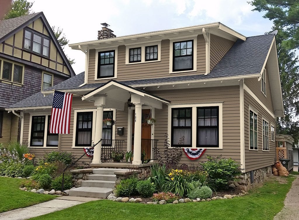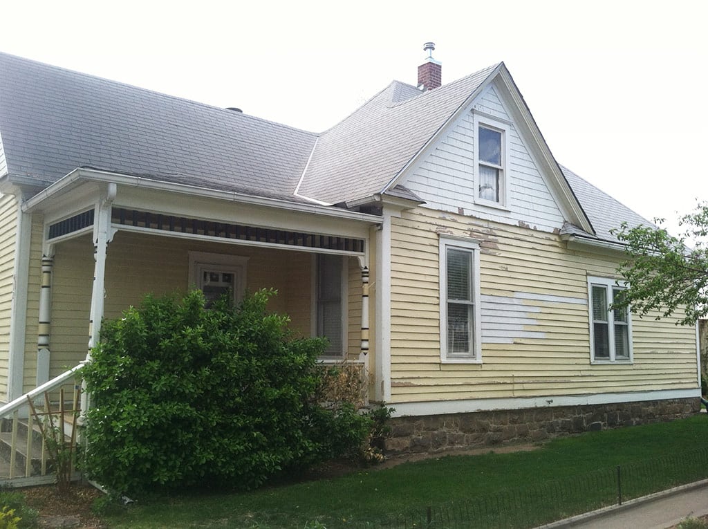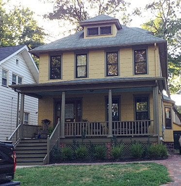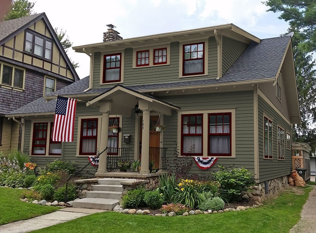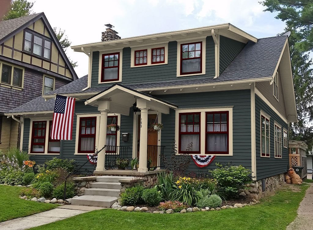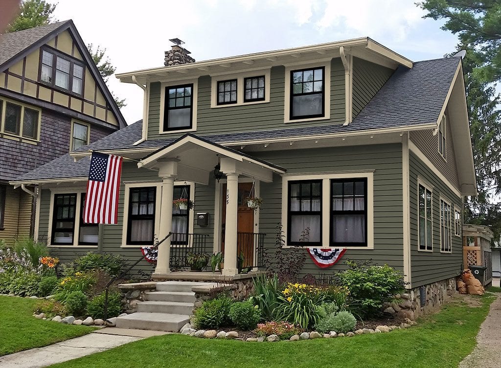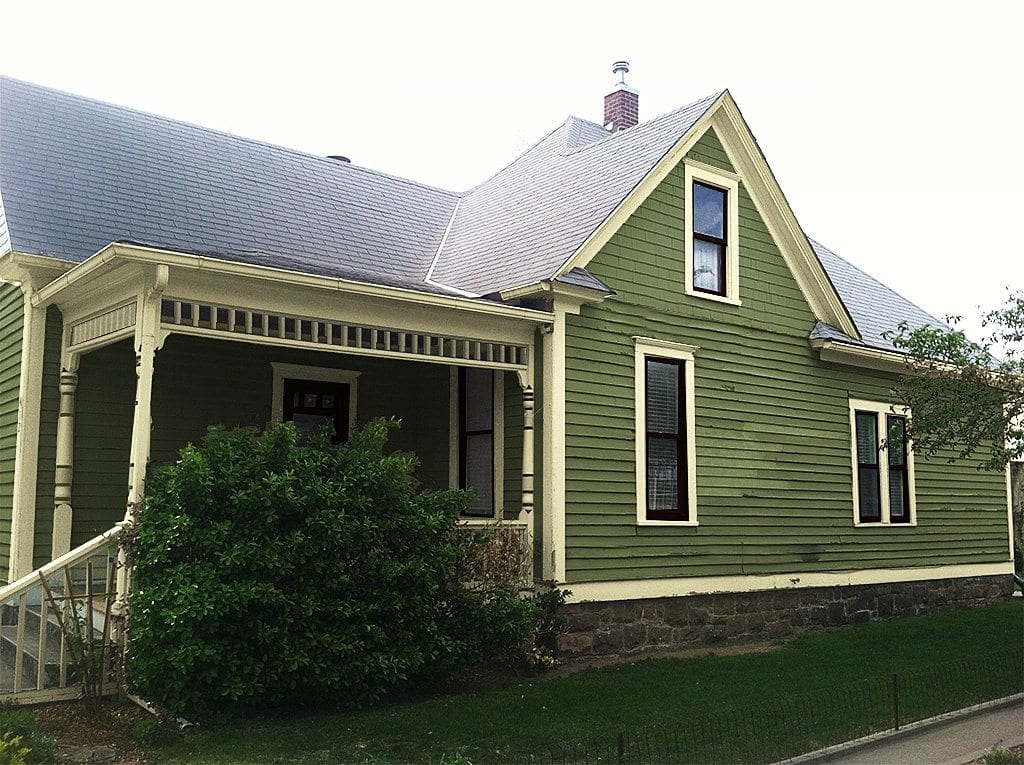 As you see in the before photo, almost every inch of the house is painted this harsh gold color. The new owners needed to fix the problem but didn’t want to paint the entire house. This deep grayish-green trim is able to tame this gold color.