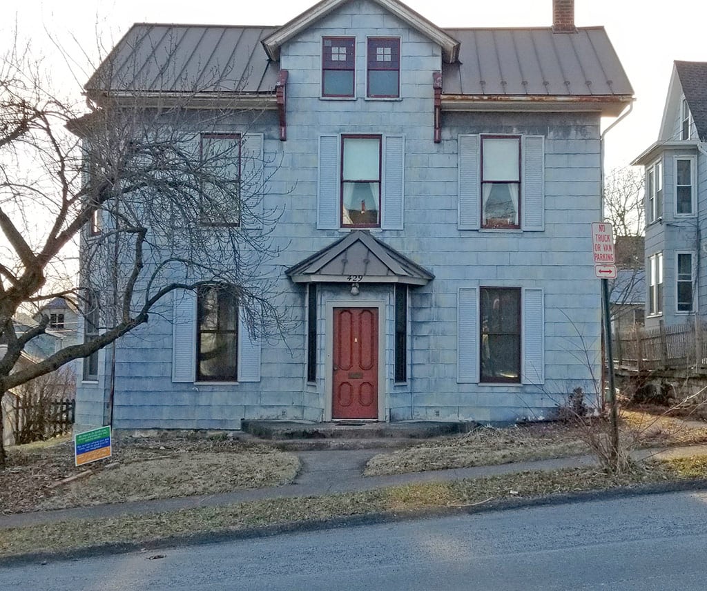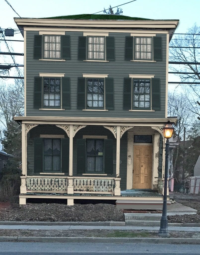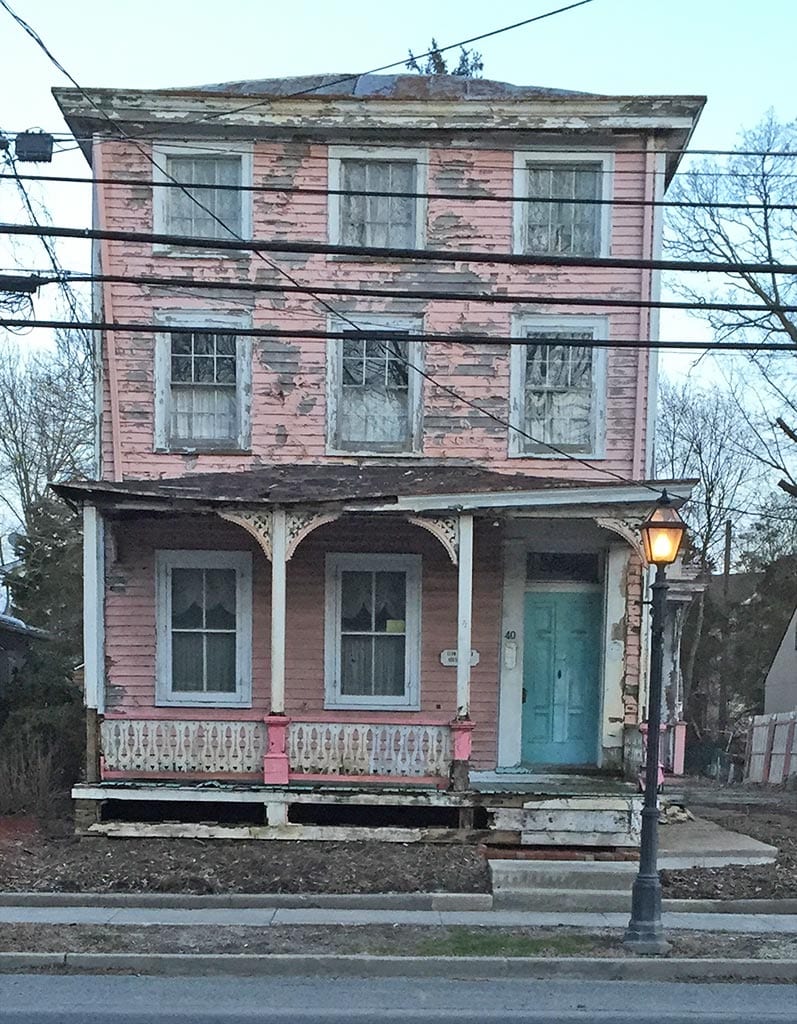 This neglected house is known by locals as the “Pink House”. With new siding added graphically and some new paint this house can still be the pink house but a bit more refined. No this is not a historic color for this 1848 home.