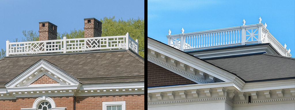 These elegant rooftop details—whether the classical railing of a Georgian house, a simple railing on a Craftsman house, or the decorative iron cresting of a Victorian mansion—add beauty, proportion, and distinction to the roofline.